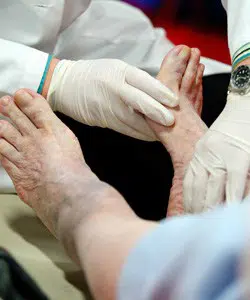 Podem formar-se úlceras nos pés de diabéticos, geralmente após uma lesão ou em locais que recebem a pressão constante, tal como o peito do pé. Outros ensaios, pode ser feitos para avaliar a circulação do pé, e para determinar a extensão da perda de sensação.